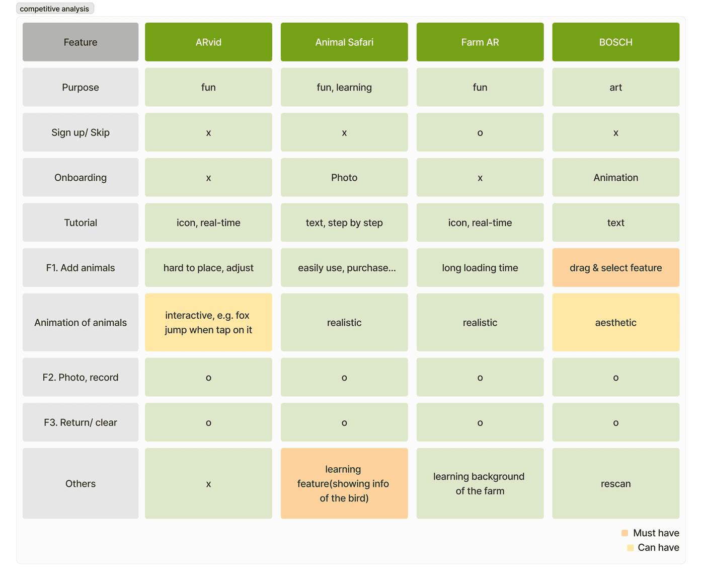 To understand common functionalities and interaction patterns in AR applications, we conducted a competitive analysis of four AR apps that feature animal placement experiences. These included ARvid, Animal Safari, Farm AR, and the Bosch app. The findings helped inform feature prioritisation and interaction design decisions.